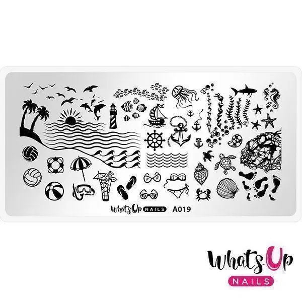 Den ultimative strand stampingplade. Bliv klar til strandturen med denne stampingplade hvor du finder sol, palmer, bølger, strandkugler, flip flops, solbriller, havskildpadde, fodspor, havvind, fyrtårn, geléfisk og mange flere.