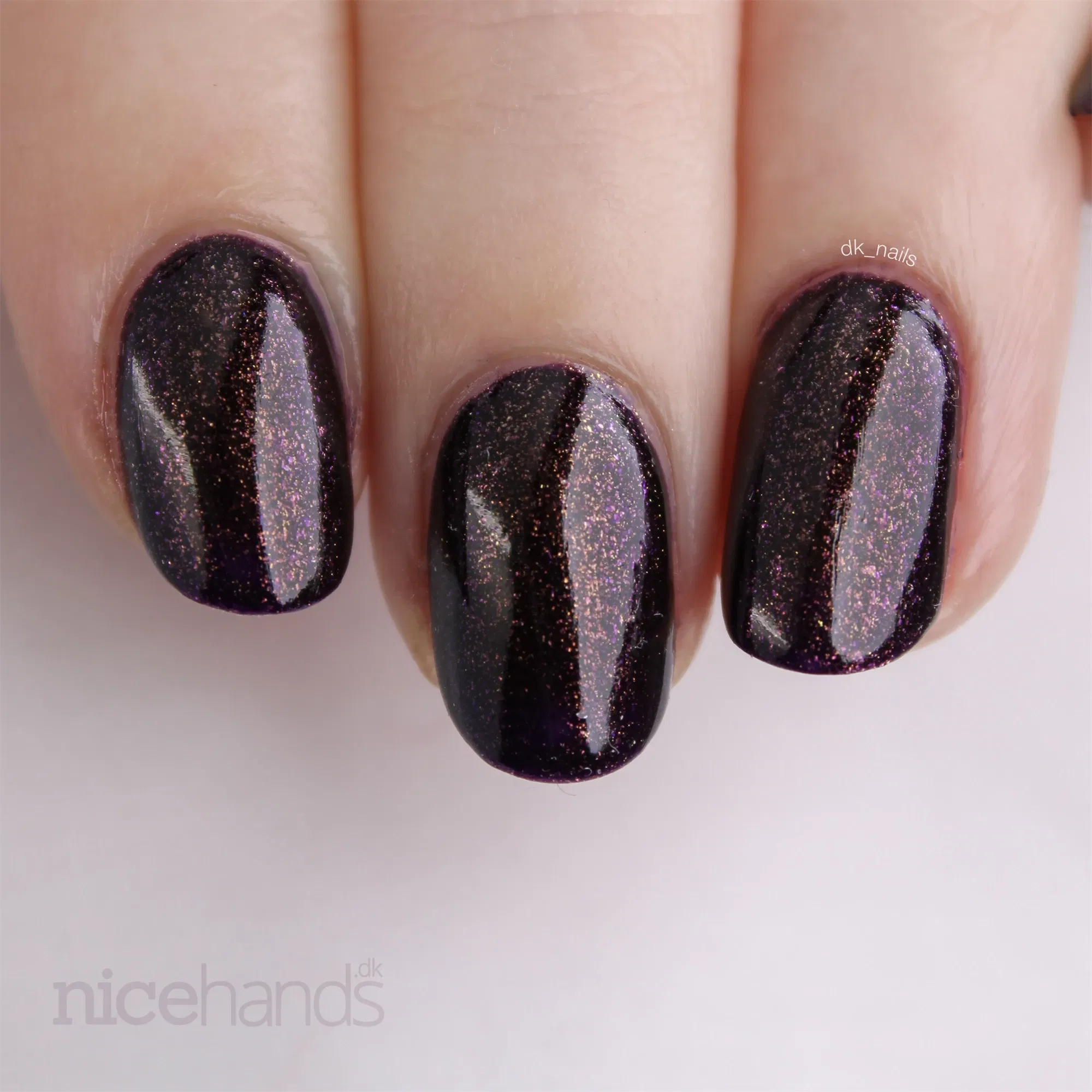 Avril er en sindsygt flot lilla neglelak med det flotteste guld shimmer i. Det flotte shimmer funkler og giver neglelakken så meget dybde og liv. Avril er heldækkende ved 2 tynde lag.