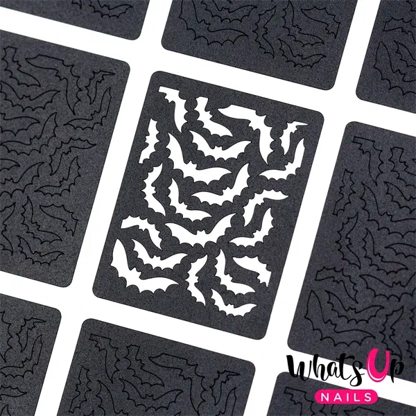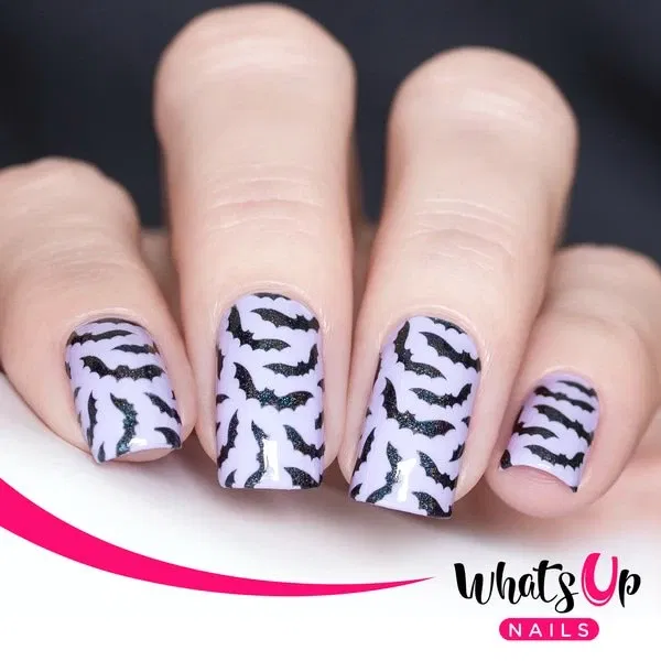 Disse stencils viser flyvende flagermus – ideelle til et spooky, halloweeninspireret look på neglene.
