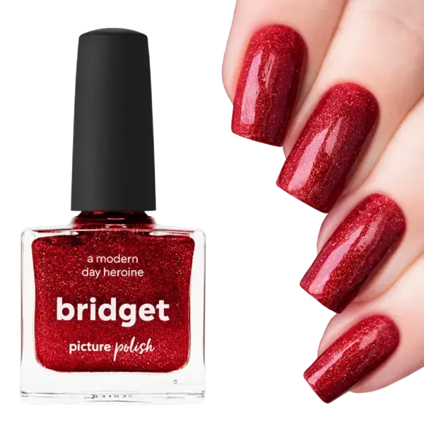 Bridget fra Picture Polish er en dyb rød jelly-neglelak med scattered holografisk effekt. Den intense røde farve kombineret med holo-flager skaber et moderne, festligt look, der eksploderer i regnbuer i sollys. En uimodståelig neglelak, der er lige så smuk til hverdag som til fest.