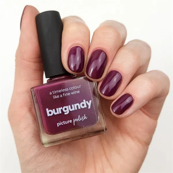 Burgundy fra Picture Polish er en dyb, tidløs rød, der emmer af elegance og selvtillid. Den cremede, pigmenterede formel lægger sig jævnt på neglene og tørrer smukt glat, så du får en intens farve med et sofistikeret udtryk.