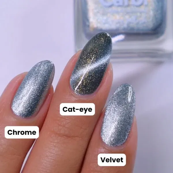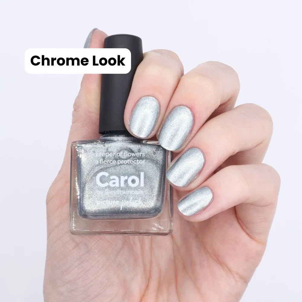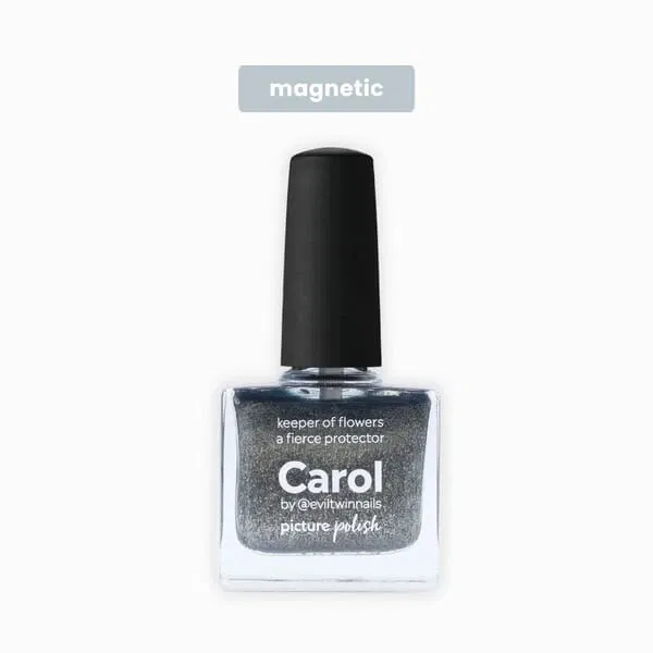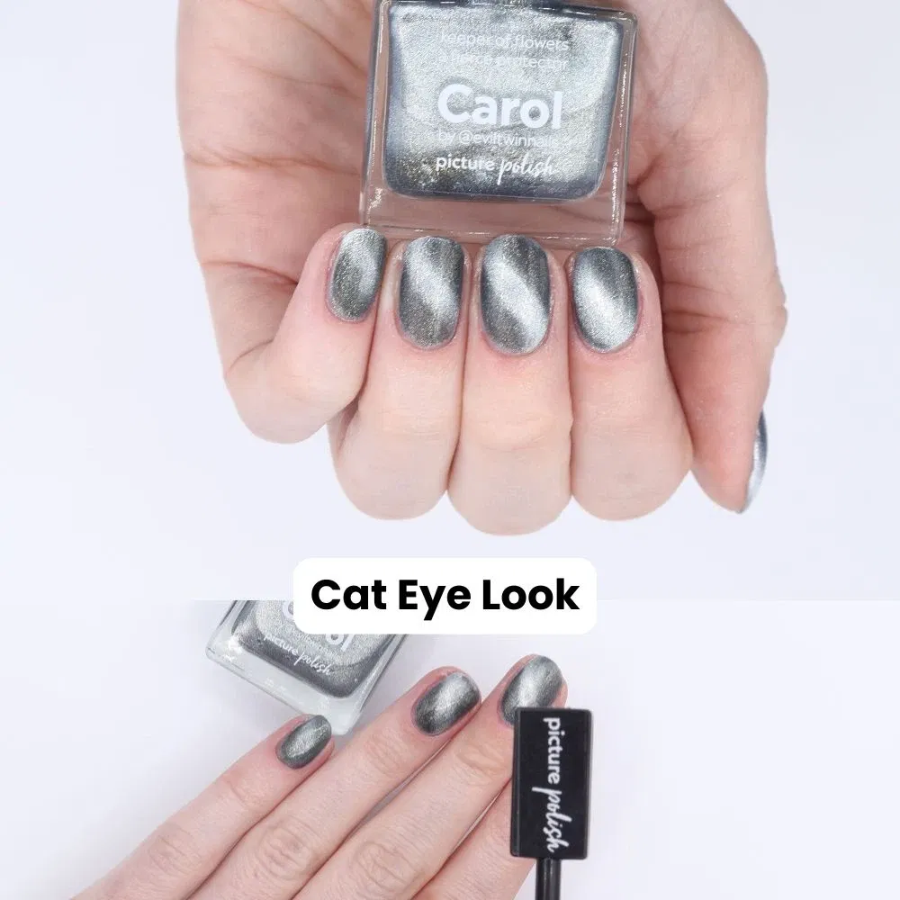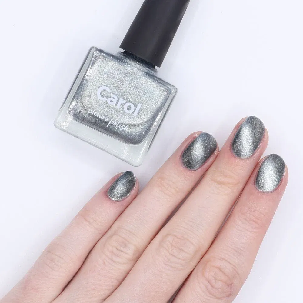 Carol er en støvet, blålig neglelak med gyldne gnister og skjulte sølvpartikler, der kan trylles frem med en magnet. Brug den som den er og nyd det bløde blågrå krom-look – eller giv den gas med magneten og skab enten blød velvet-effekt eller en vild cat eye. Den er lige så alsidig som den er smuk.