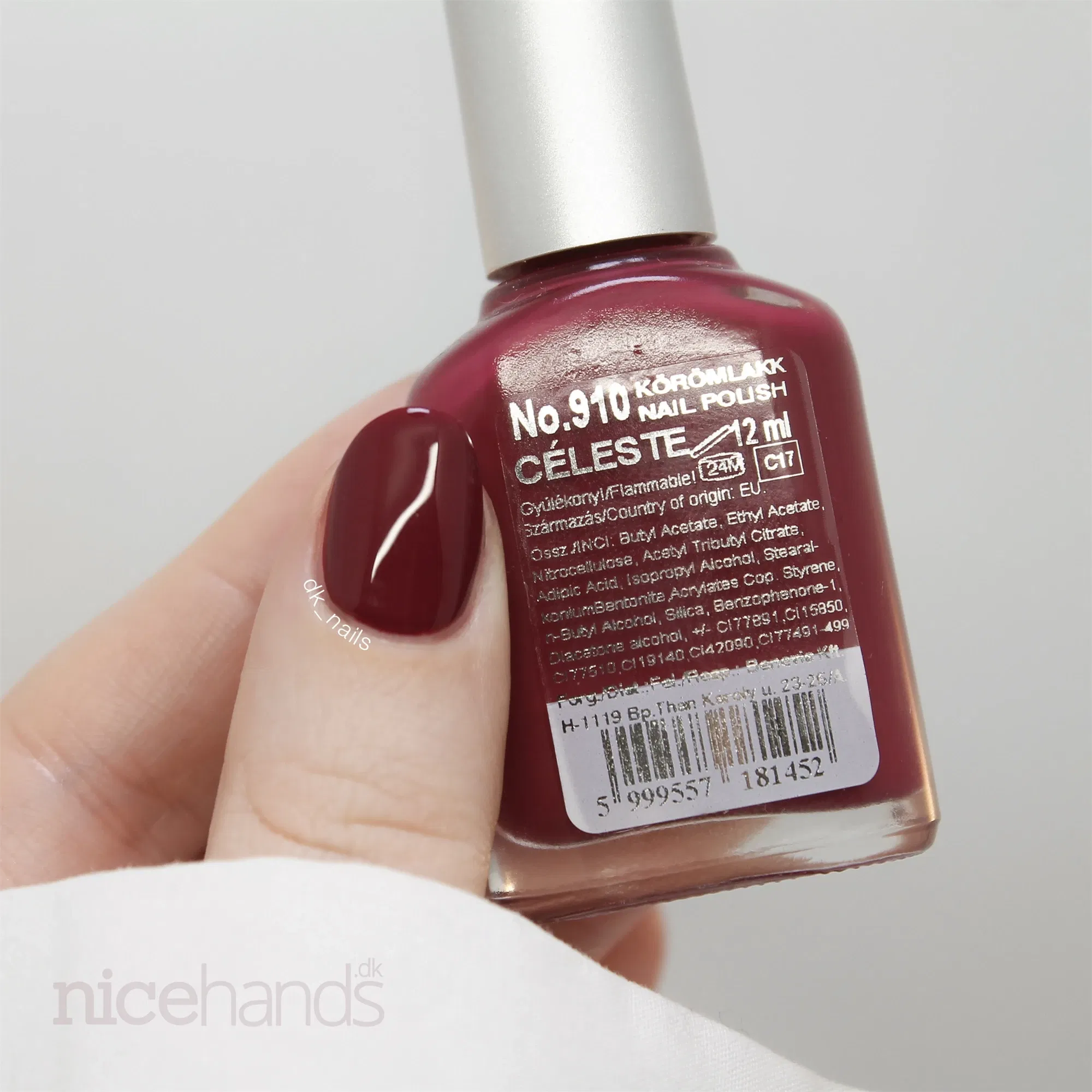 Céleste er en smuk rød neglelak med kraftige cerisefarvede undertoner. Neglelakken er heldækkende ved 2 tynde lag og giver et smukt og klassisk look. Céleste er én af mine favoritter da jeg synes den har en helt speciel lækker nuance. Céleste er DRØN lækker!