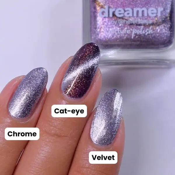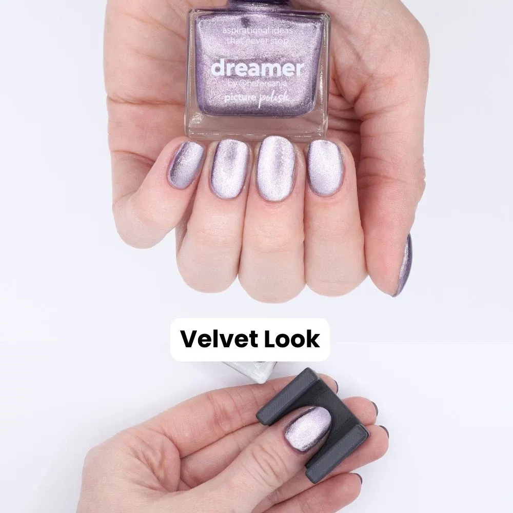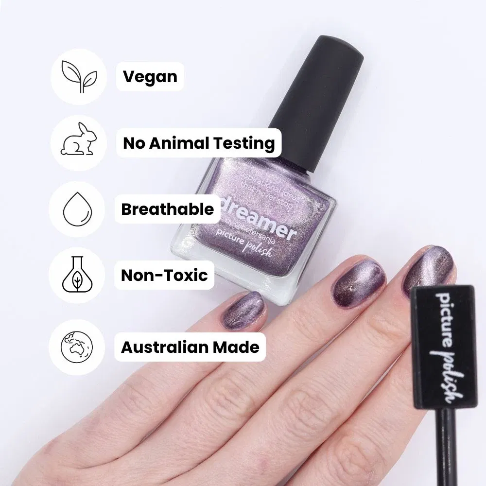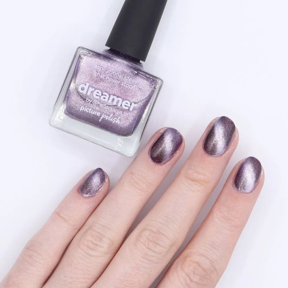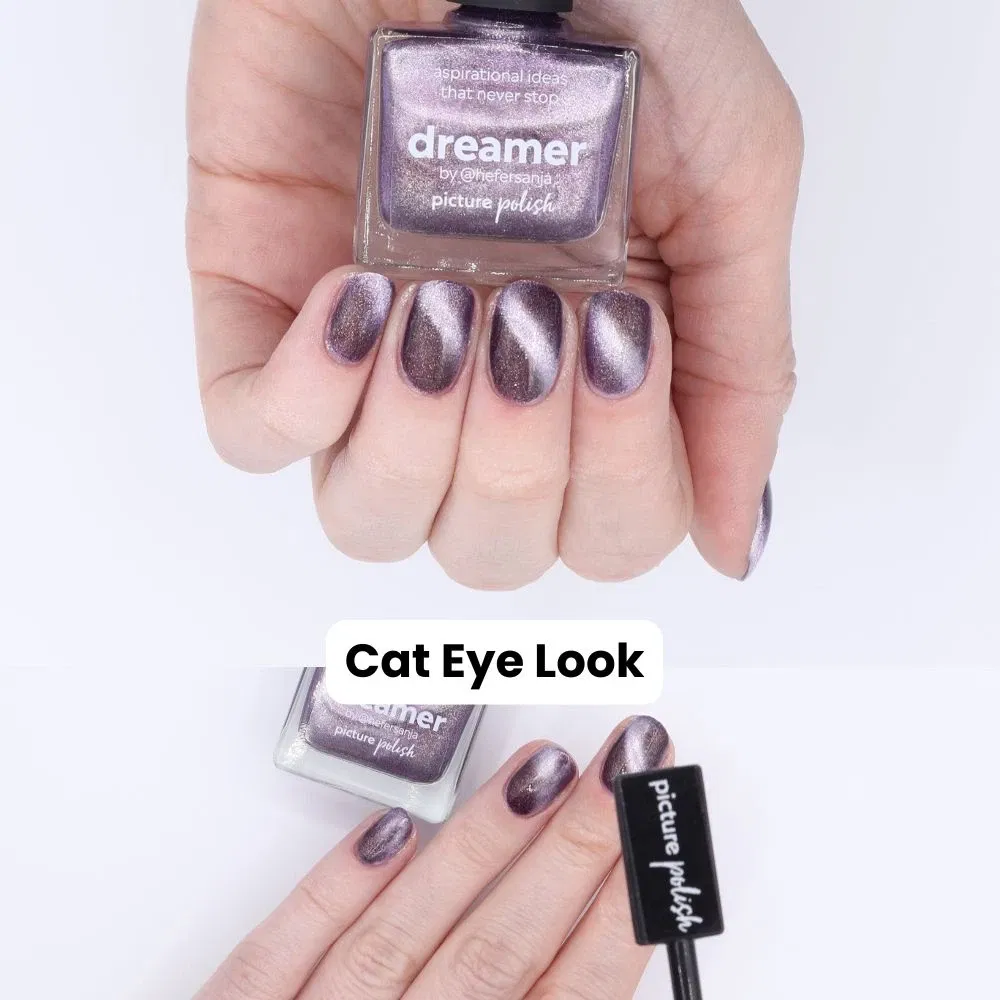Dreamer er en varm, cremet mauve med et strejf af gyldent skær og sølvmagnetiske partikler. Når du bruger en magnet, træder den fine cat eye-effekt frem og giver et elegant, drømmende spil i overfladen. En afbalanceret og neutral nuance med et twist – perfekt til dig, der elsker bløde farver med noget ekstra.