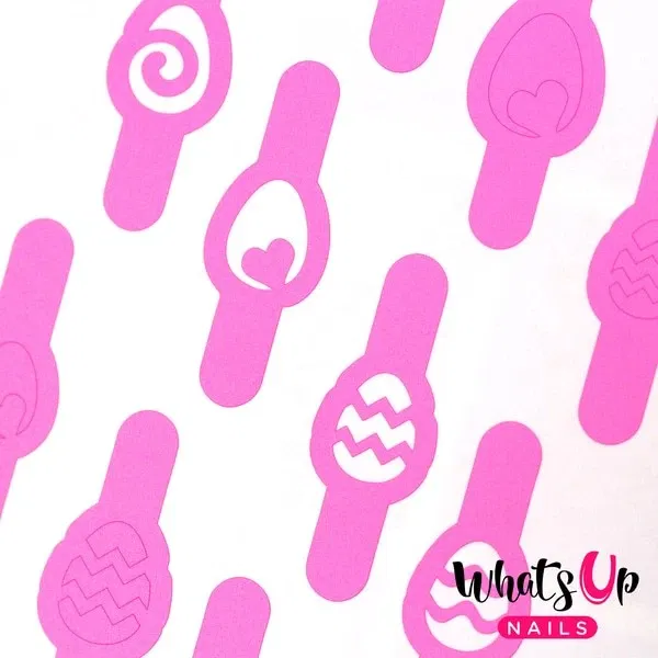 Disse stencils viser små, varierende påskeæg i kombinationer af striber, prikker og hjerter – perfekte til et farverigt og festligt look. Designet giver neglene en legende, forårsagtig stemning og passer godt til pastel- og nude-baser.