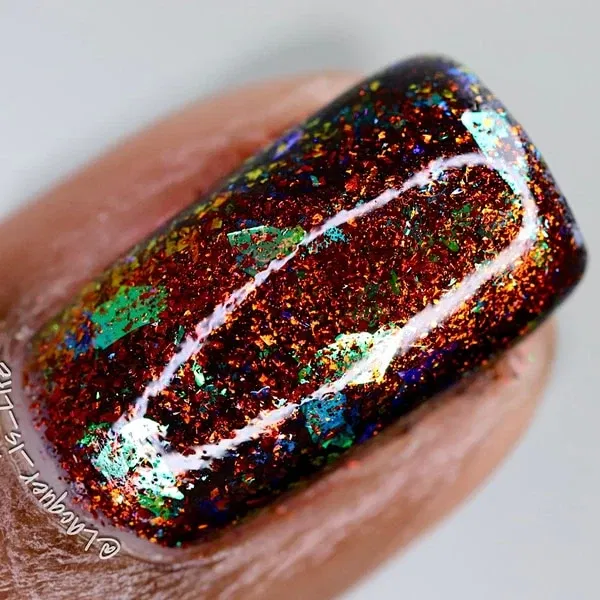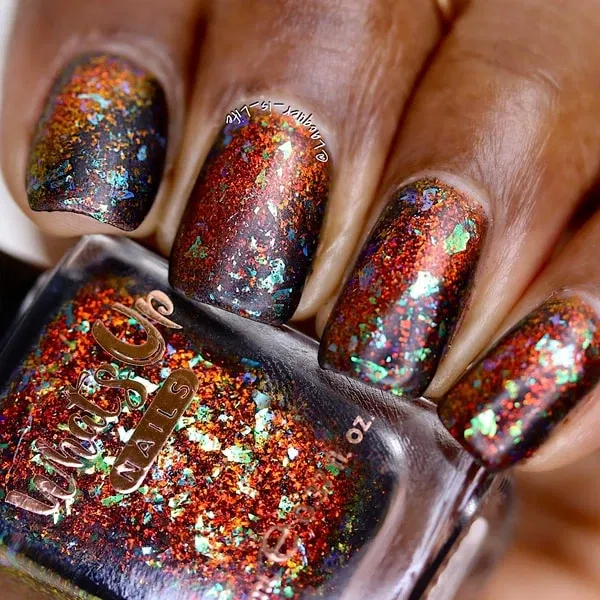 Foliage Folie er en magnetisk mørkeblå neglelak med orange iriserende flakies, der skifter i blå, orange og grønne toner. Når den aktiveres med en magnet, opstår der et dragende og flerfarvet effekter – perfekt til årstidens mørkere looks.