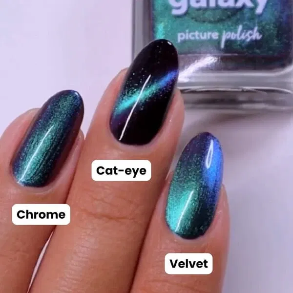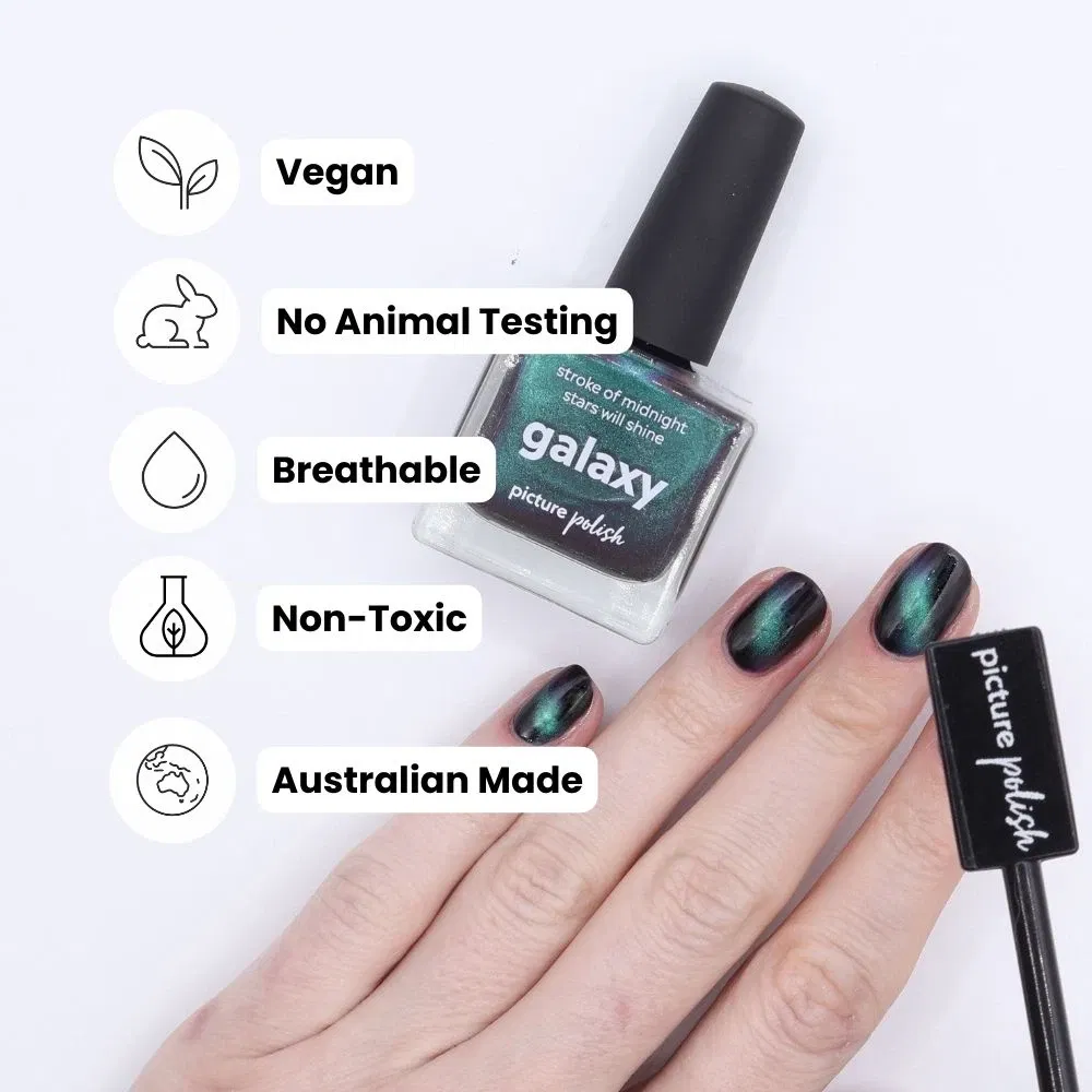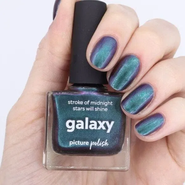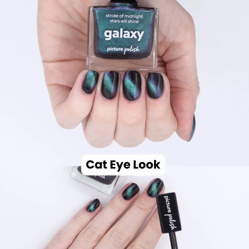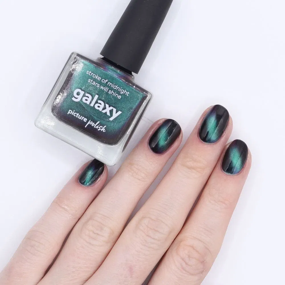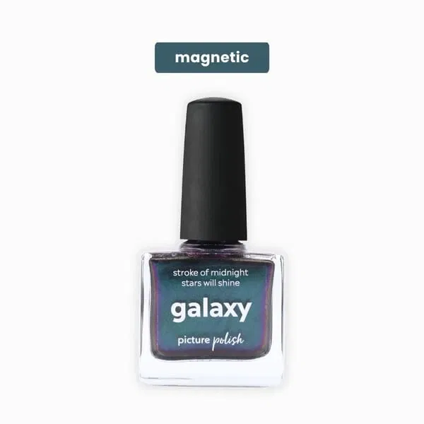 Galaxy er en magnetisk multichrome-lak med en mørk base, der skifter farve fra grøn til blå til lilla – alt efter lyset. De sølvmagnetiske partikler giver en intens cat eye-effekt, når du bruger en magnet, og skaber et dybt, kosmisk spil på neglene. En kraftfuld og dragende farve til dig, der elsker kontraster og glød.