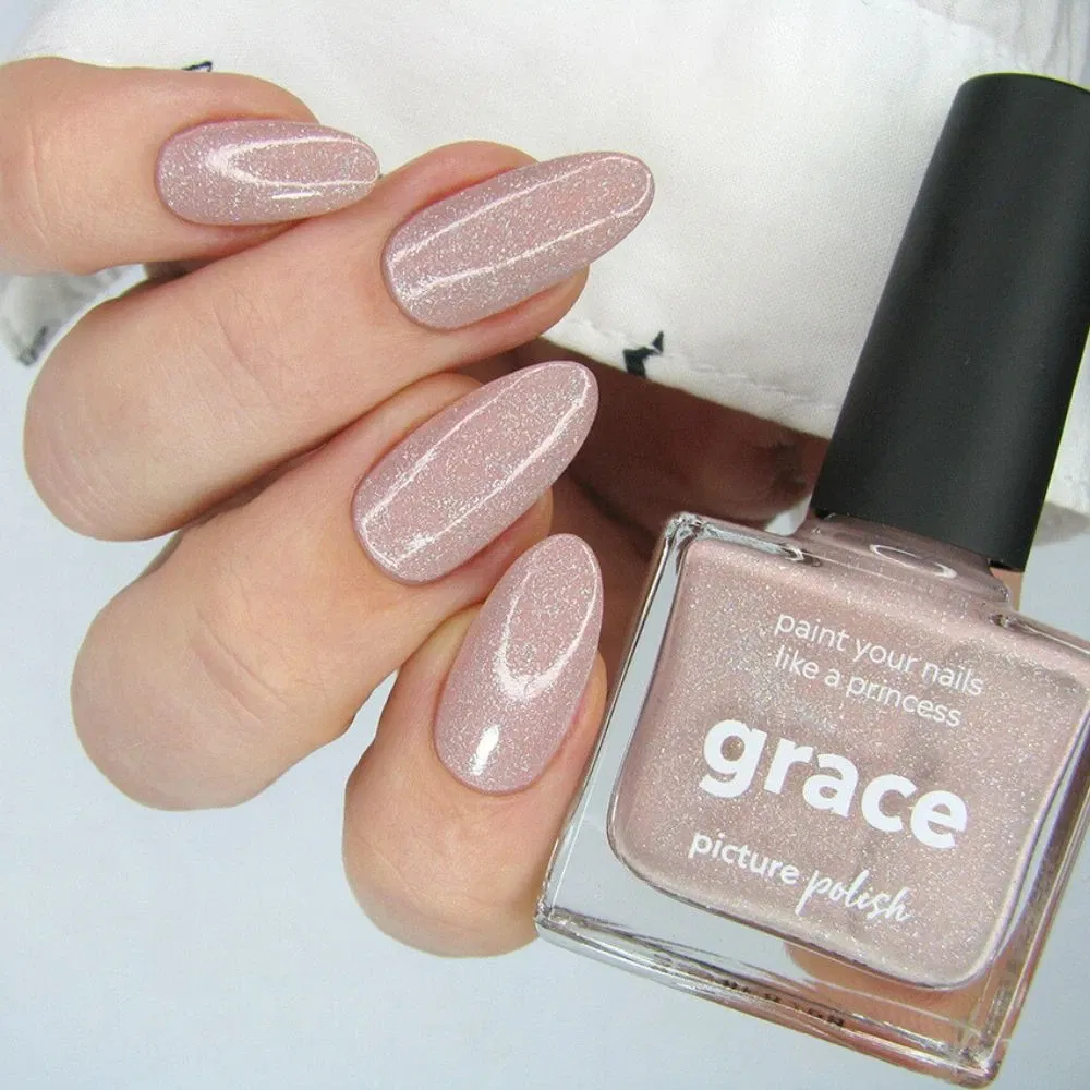 Grace fra Picture Polish er en nedtonet lyserød neglelak med fine scattered holografiske elementer, der funkler smukt i lyset. Den feminine nuance kombineret med holo-effekten giver et delikat, men iøjnefaldende udtryk. Ikke underligt, at Grace er en af de mest populære og bedst sælgende farver.