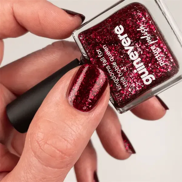 Guinevere fra Picture Polish er en strålende rød neglelak med sølvflager, der tilfører dybde og et festligt glimt. Den let transparente formel giver farven et lagdelt udtryk, hvor lyset fremhæver både en intens rød, diskrete sølvreflekser og et strejf af pink. Resultatet er en elegant og levende lak med masser af spil.