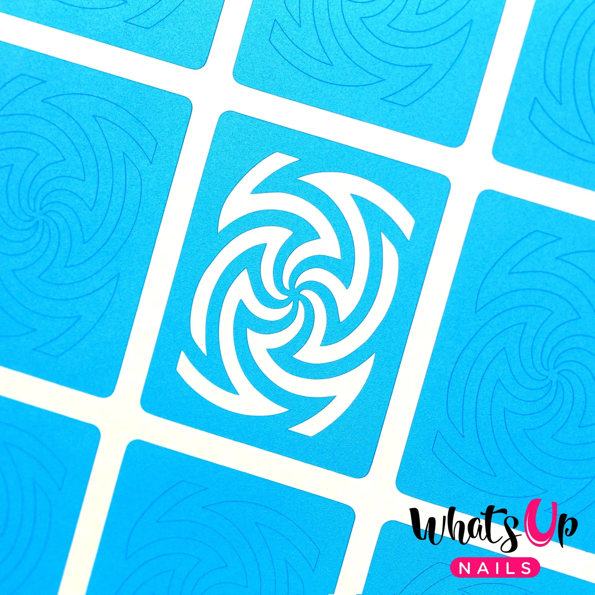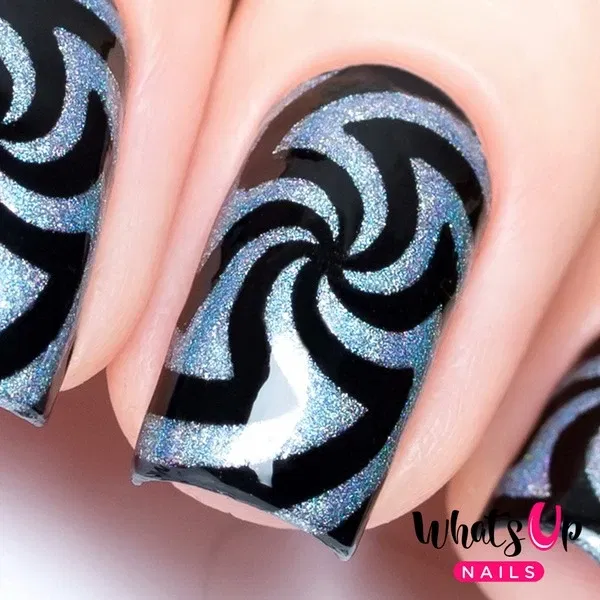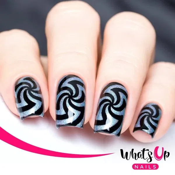 Disse stencils viser cirkulære og spiralagtige designs, der skaber et vildt hypnotisk visuelt effekt – perfekt til et iøjnefaldende og kreativt neglestyle. Designet sætter fokus på bevægelse og optisk spil.
