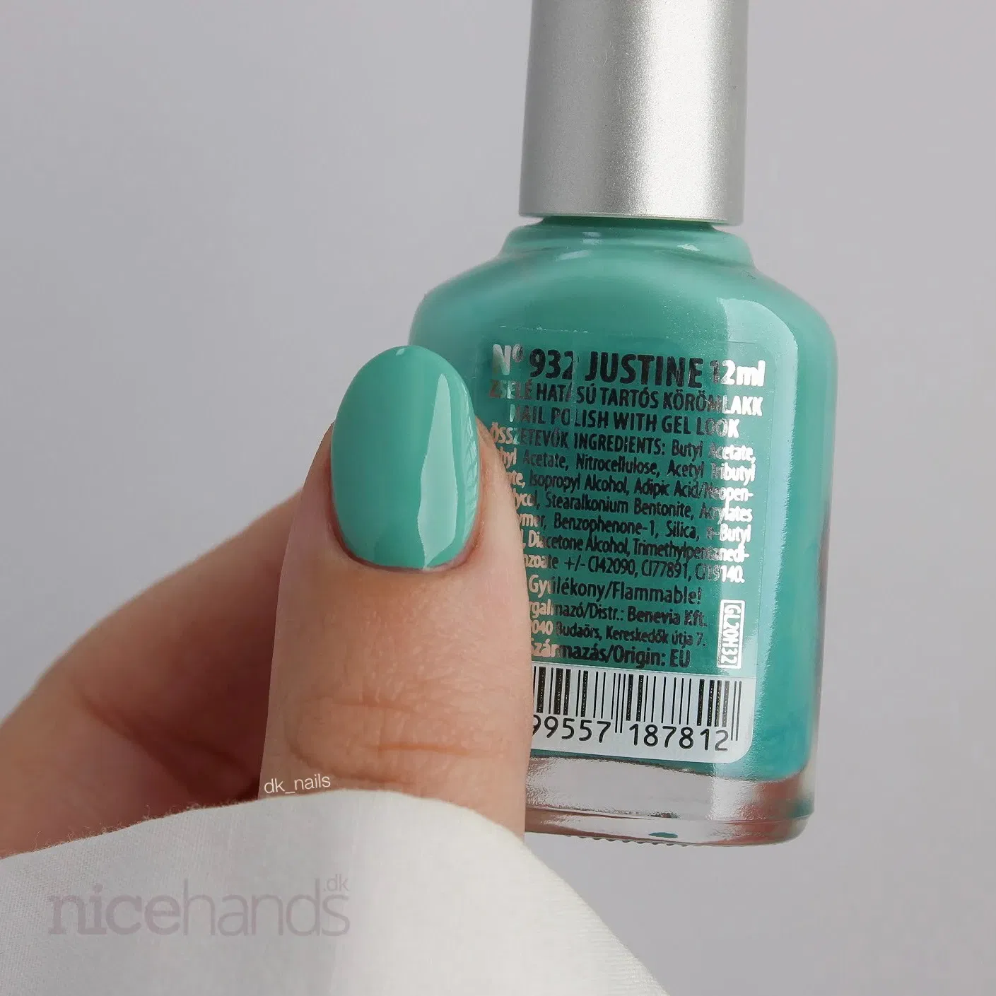 Justine er en heldækkende mint farvet neglelak. Mint farvede neglelakker er et hit og det samme er Justine. Den mintfarvede skønhed har en anelse diskret shimmer i sølv. Dette er med til at give neglelakken liv og et lækkert touch.