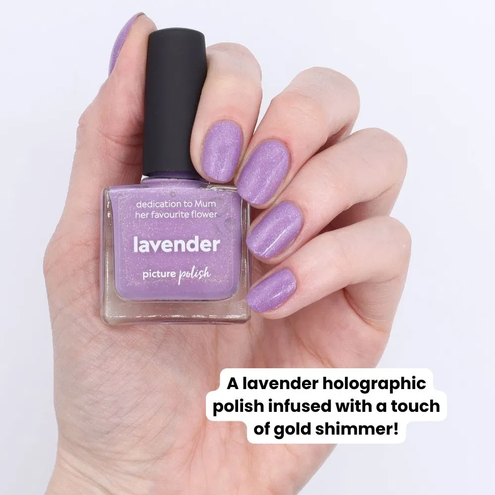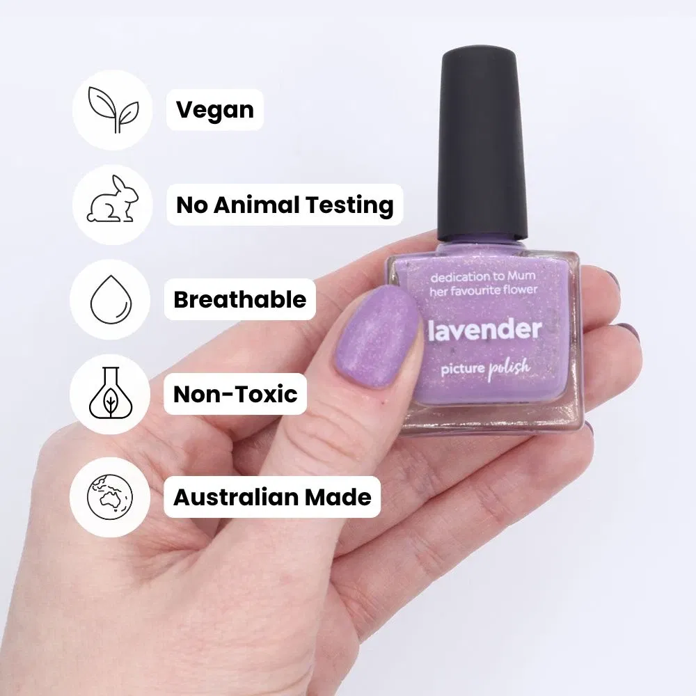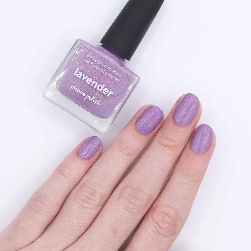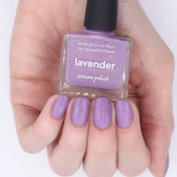 Lavender er en sart, lyse-lavendel nuance der balancerer mellem pastel og lidt kraftigere — ikke for kølig, men med en let kølig tone. Den giver et fredfyldt, perfekt til foråret eller som en rolig baggrund for negledesign og dekorationer.