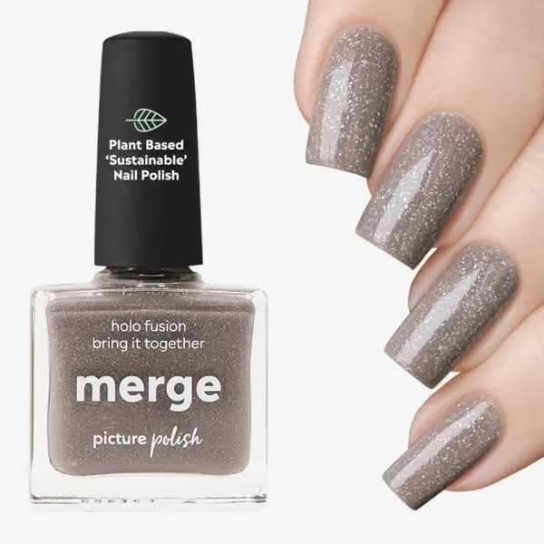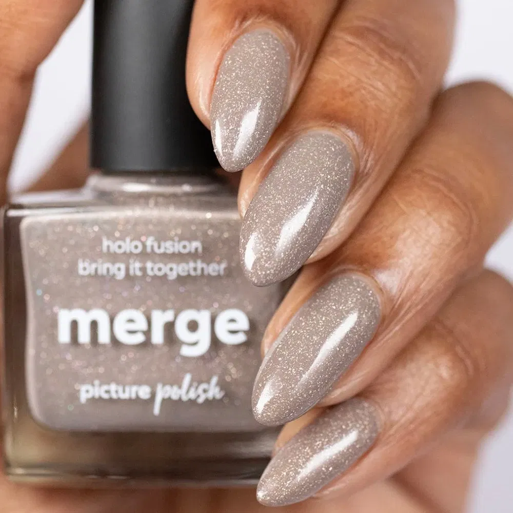 Merge fra Picture Polish er en sofistikeret gråbrun neglelak med scattered holografisk effekt. Den neutrale taupe-base får liv af de funklende holo-partikler, som giver et elegant og moderne spil i farven. Man kan godt putte den under kategorien "nude" med et twist!