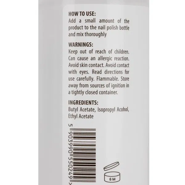 Med denne universelle fortyndingsvæske kan du give tykkere neglelakker nyt liv. Den fungerer til alle mærker og gør det nemt at genskabe den perfekte konsistens – så lakken igen glider jævnt på neglen uden striber eller klumper.