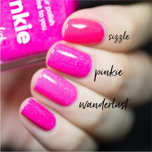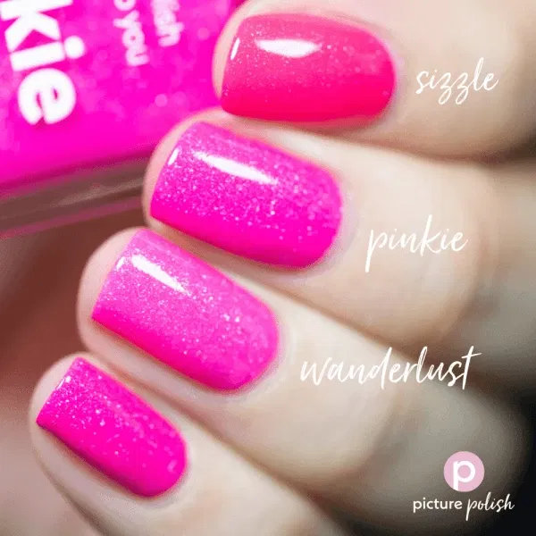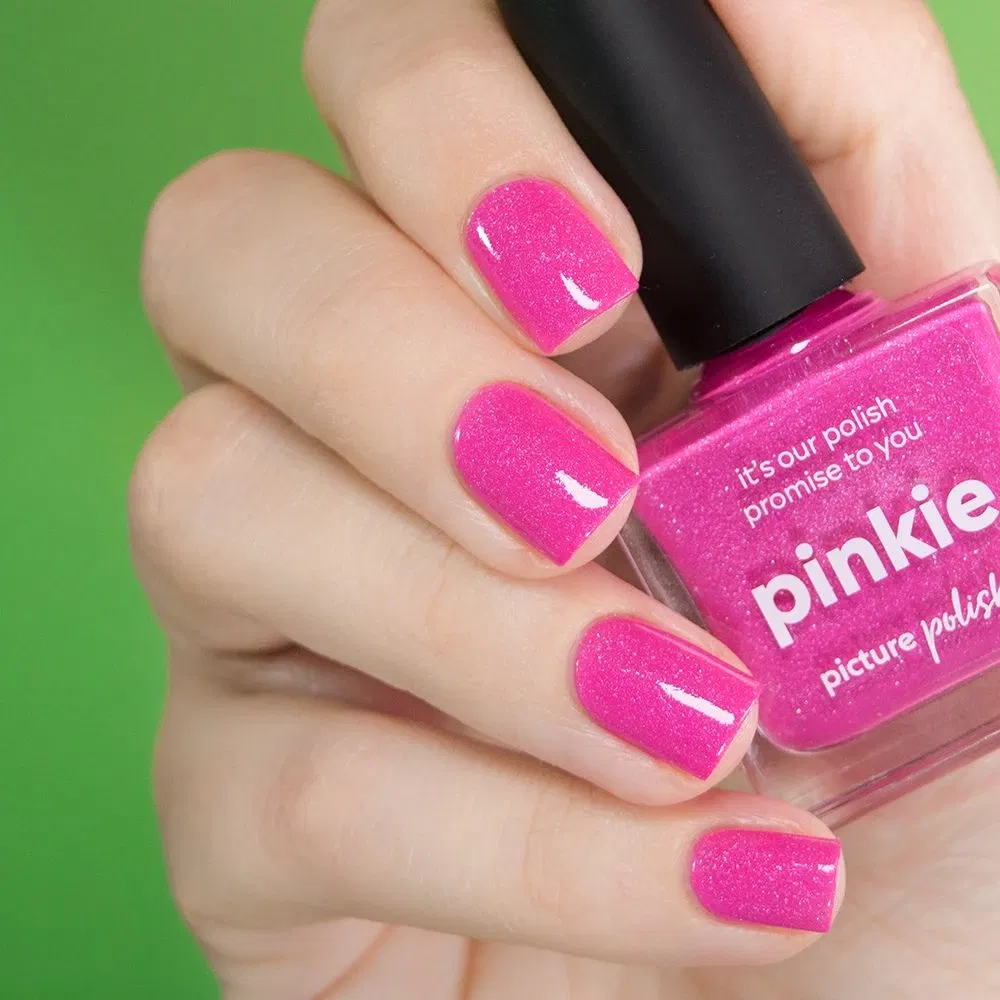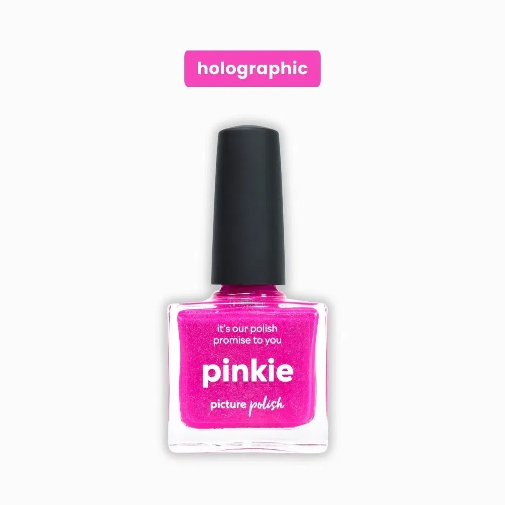 Pinkie fra Picture Polish er en iøjnefaldende neon pink neglelak spækket med små sølvfarvede holografiske flakes. Resultatet er en frisk, livlig og funklende pink, der tiltrækker opmærksomhed fra første blik. Lakken tørrer en smule mat op, men får et smukt, shiny look, når du afslutter med topcoat.