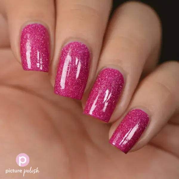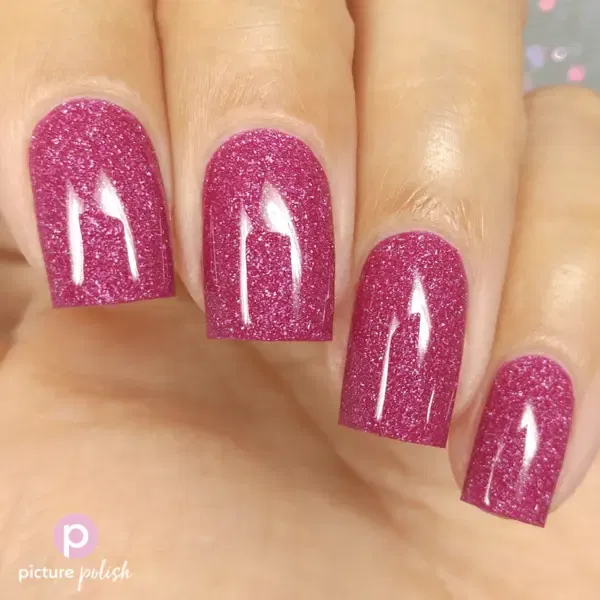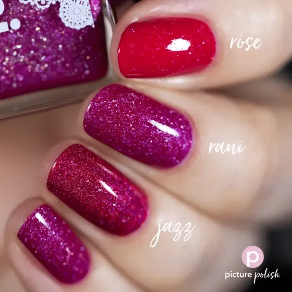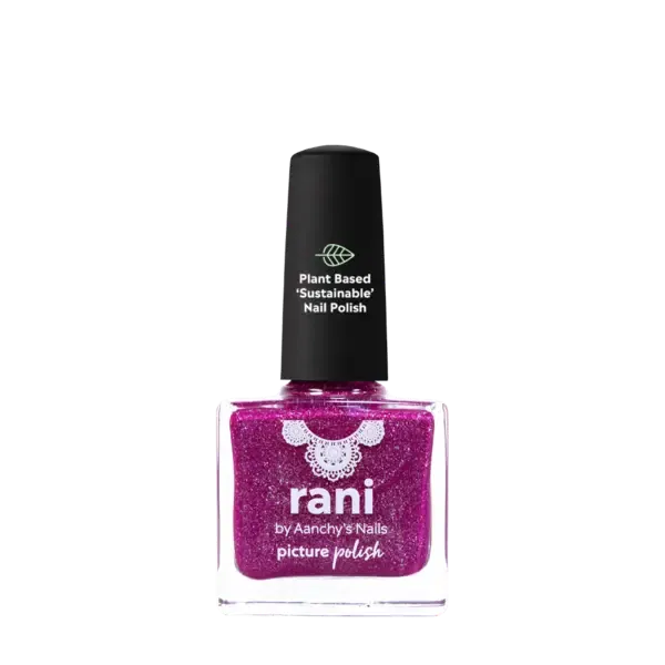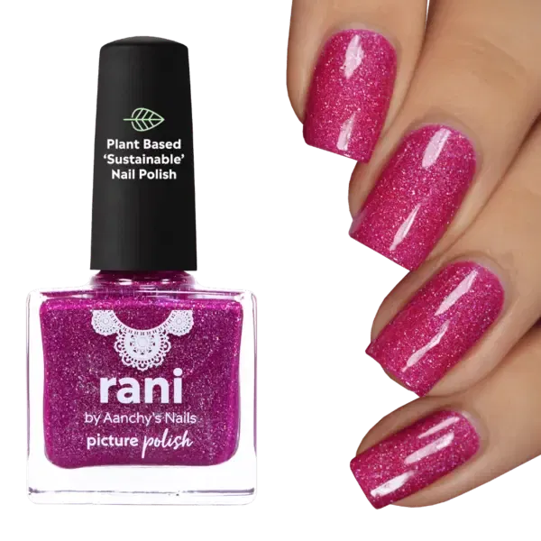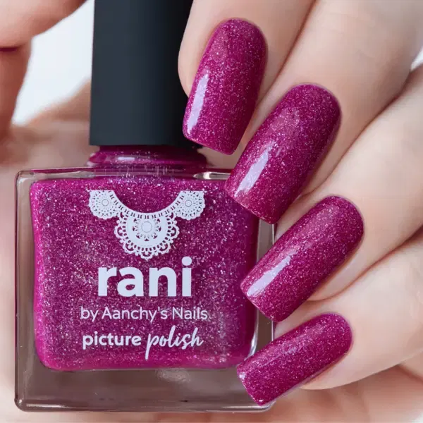 Rani fra Picture Polish er en smuk rubinrosa crystal-jelly neglelak med holografiske flakes. Den transparente baselak giver mulighed for at opbygge farvens dybde med ét eller to lag, og de fine holo-flakes tilfører et funklende spil af lys og farve.