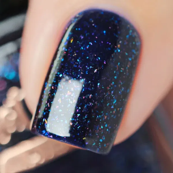 Squid Escape er en fantastisk mørke blå crelly-negellak med iriserende flakies, der skifter mellem blå og grønne toner. En frisk, vand-inspireret nuance med et legende og glitrende look.